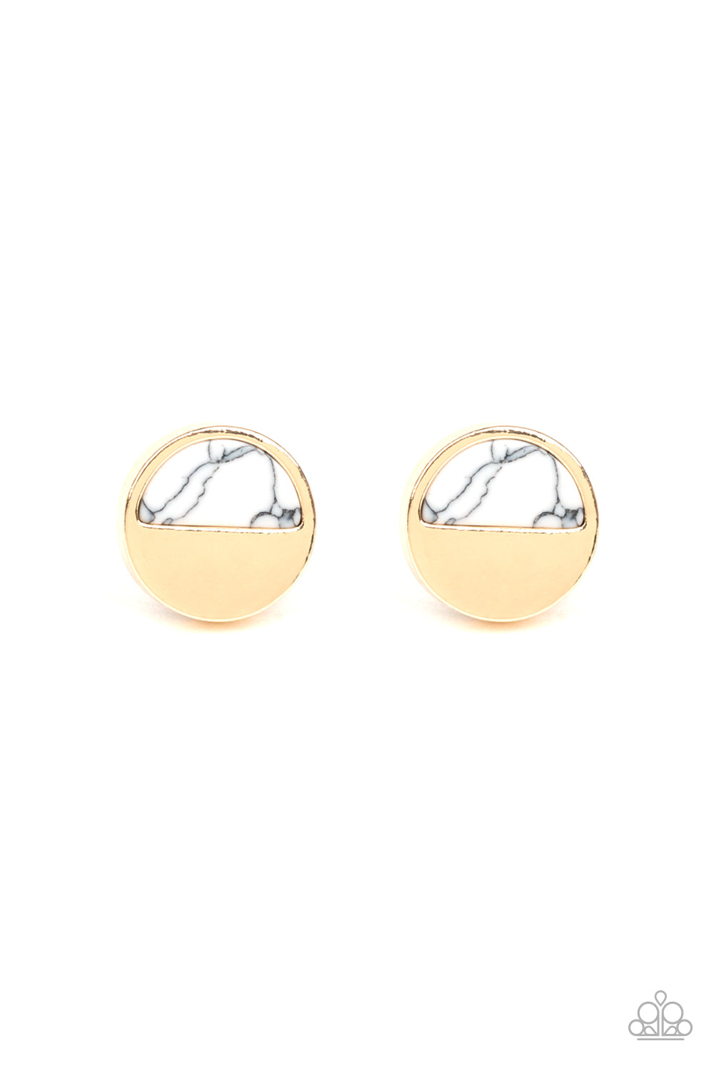 Featuring a half-moon shape, a piece of faux white stone is pressed into one half of a gold disc for a sleek look. Earring attaches to a standard post fitting.