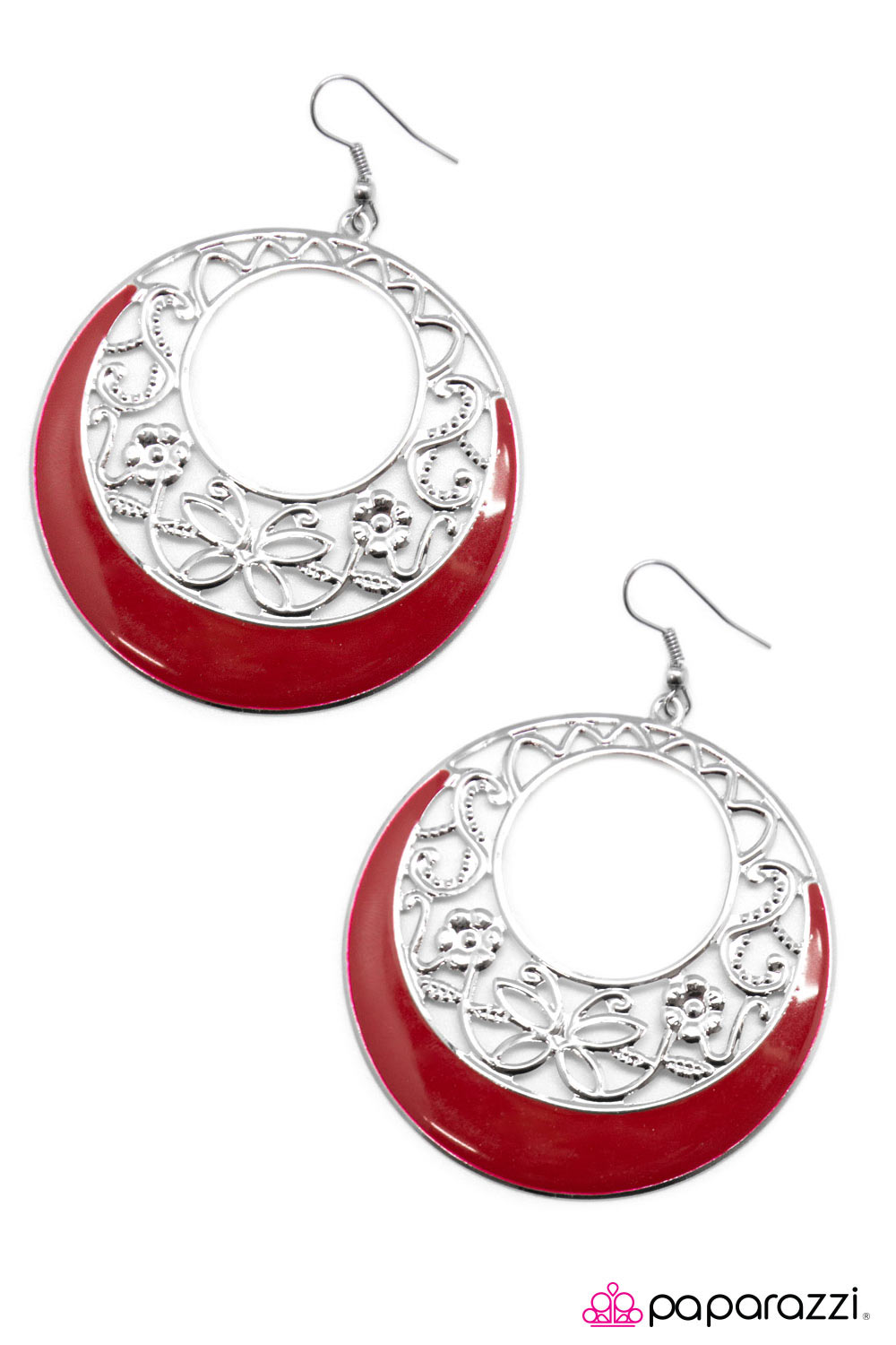 Infused with red crescent wrap, stunning silver floral filigree loops into an airy inner frame for a feminine display. A silver butterfly silhouette adorns the center for whimsical finish. Earring attaches to a standard fishhook fitting.