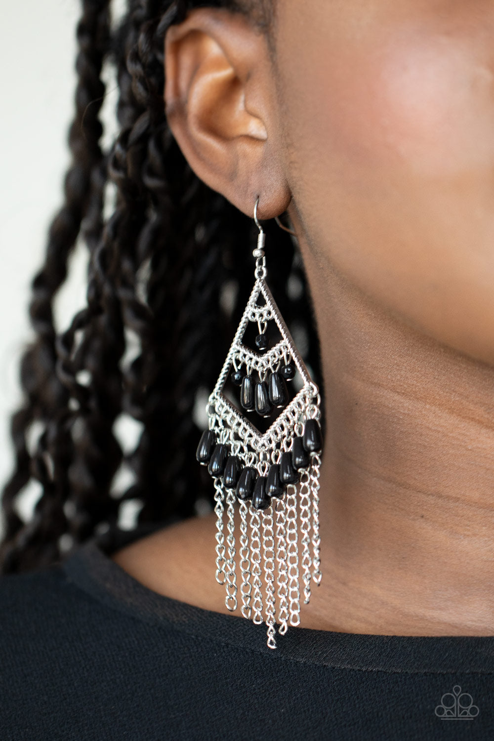 Dainty black teardrop beads cascade from three tiers of a silver kite-shaped frame. Shimmery silver chains stream from the bottom of the frame, adding movement to the colorful fringe. Earring attaches to a standard fishhook fitting.