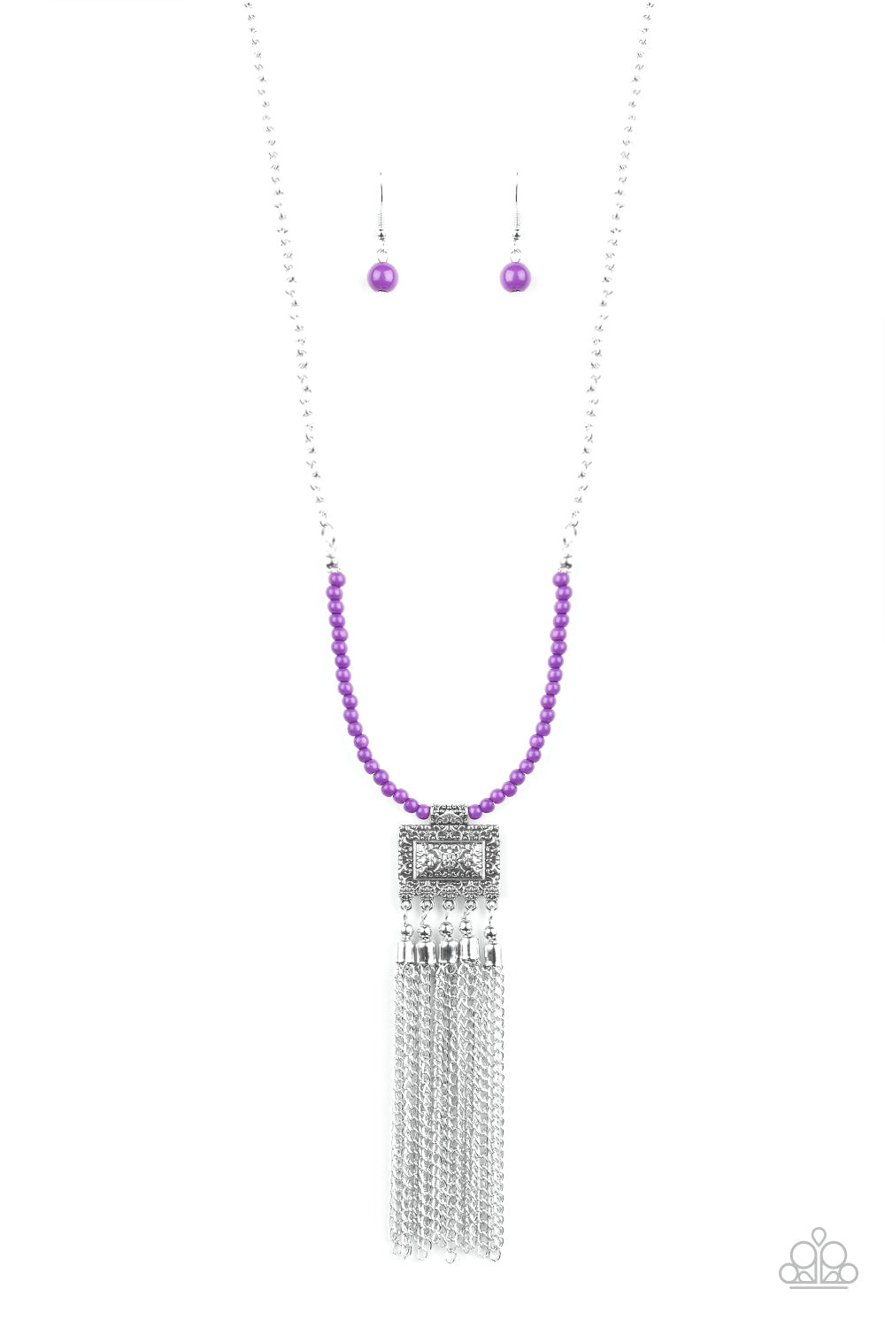 Attached to the bottom of a shimmery silver chain, a row of dainty purple beads gives way to an ornate silver frame radiating with a beaded silver chain fringe for an adventurous look. Features an adjustable clasp closure.